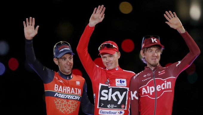 El Ganador de la Vuelta a España 2017, el ciclista británico del equipo Sky Chris Froome (c), el segundo clasificado el italiano del equipo Bahrain-Merida Vincenzo Nibali (i) y el tercer clasificado el ruso del equipo Katushha Alpecin Ilnur Zakarin (d)