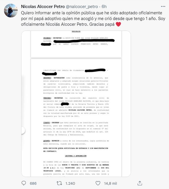 “Quiero informar ante la opinión pública que he sido adoptado oficialmente por mi papá adoptivo quien me acogió y me crió desde que tengo 1 año. Soy oficialmente Nicolás Alcocer Petro. Gracias papá”, mencionó Nicolás.