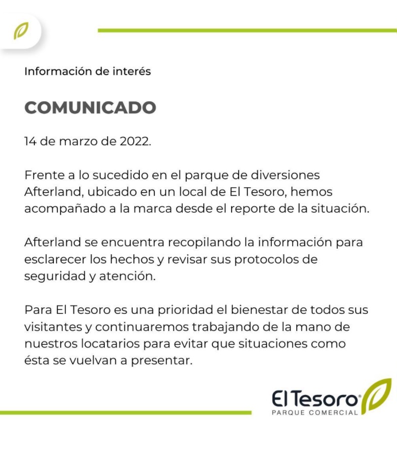 Por su parte, el centro comercial en el que se encuentra el parque de diversiones donde ocurrió el hecho, emitió un comunicado y señaló que: “hemos acompañado a la marca desde el reporte de la situación”, la cual “se encuentra recopilando la información para esclarecer los hechos y revisar sus protocolos de seguridad y atención”.