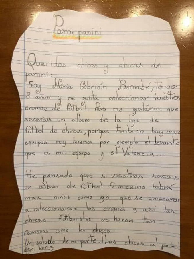 Nuria Cebrián Bernabé de 8 años es coleccionista de las calcomanías del álbum de Panini de La Liga española, sin embargo le escribió una carta a la empresa encargada de realizar el albúm para que también consideren imprimir uno de la primera división femenina.