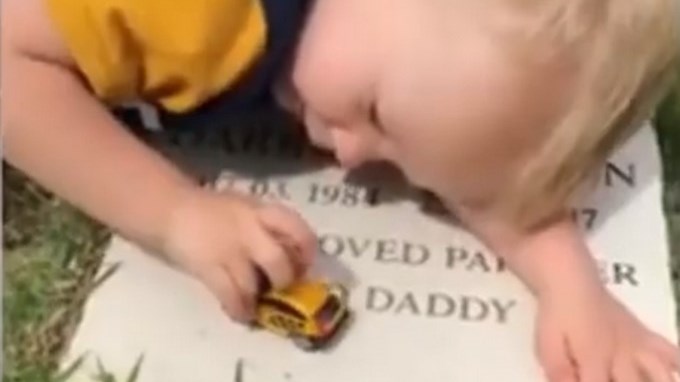 El pequeño Harvey jugando en la tumba de su padre. Foto: Facebook.