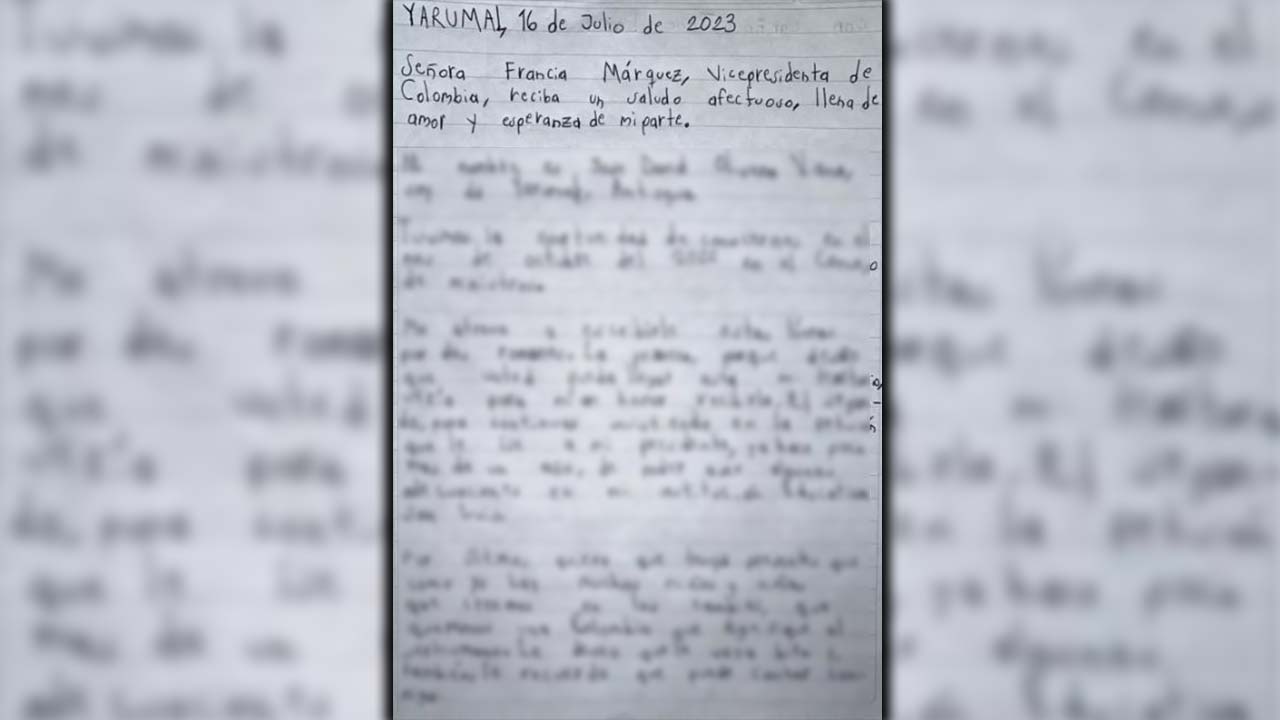 El menor, llamado José David Olivera, va en sexto grado y estudia en la Institución Educativa San Luis, y especificó en la carta que conoció a Francia en octubre de 2022, cuando la mandataria asistió a un Consejo de Ministros en el municipio.