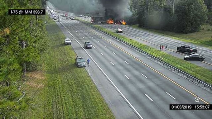 Cuando los dos camiones chocaron se derramaron unos 190 litros de combustible en la calzada y se desató un incendio que quemó a tres de los cuatro vehículos afectados en el accidente, ocurrido en el condado de Alachua, 200 kilómetros al norte de Orlando, ciudad conocida por sus numerosos parques temáticos.