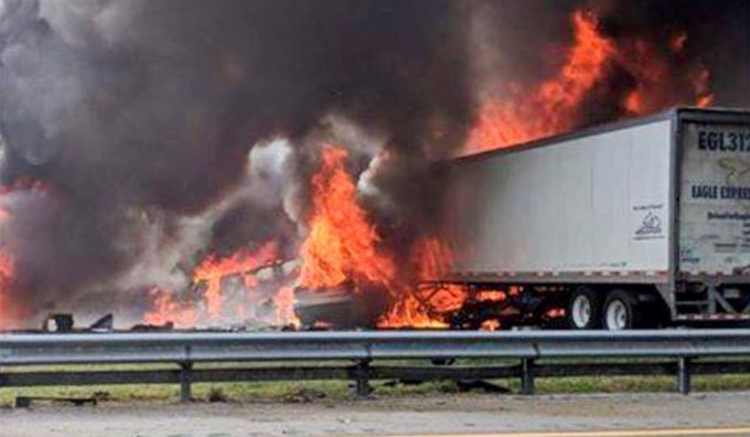 Cuando los dos camiones chocaron se derramaron unos 190 litros de combustible en la calzada y se desató un incendio que quemó a tres de los cuatro vehículos afectados en el accidente, ocurrido en el condado de Alachua, 200 kilómetros al norte de Orlando, ciudad conocida por sus numerosos parques temáticos.