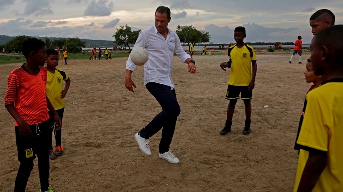 El exfutbolista, que ahora trabaja como panelista en un programa de la cadena Fox Sports, fue recibido con un baile típico del Caribe colombiano que fue ejecutado por los niños más pequeños y luego jugó fútbol con otros jóvenes.