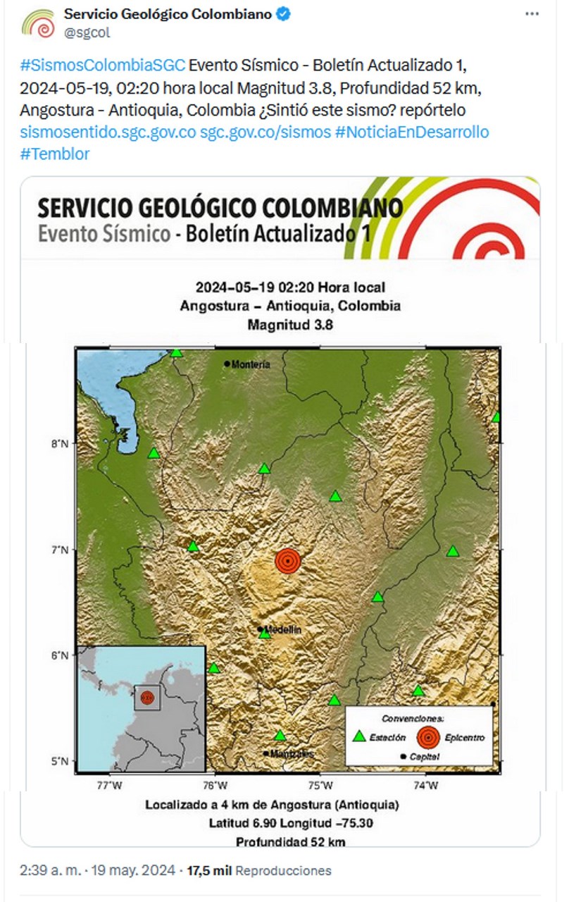 Minuto30.com .- Dos sismos se registraron la madrugada de este 19 de mayo; ambos con epicentro en una misma población de Antioquia y con diferencia de solo dos minutos.