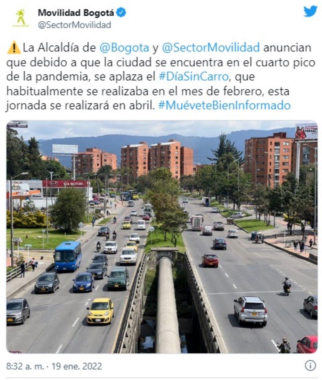 Teniendo en cuenta que el jueves 3 de febrero, fecha en la que se realizaría la jornada del Día sin Carro y sin Moto, podría coincidir con el cuarto pico de contagios por COVID-19 en la ciudad de Bogotá, la Alcaldía Mayor y la Secretaría Distrital de Movilidad aplazaron la jornada para ser realizada en el mes de abril.