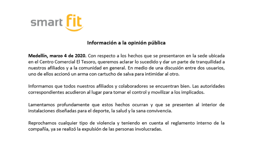 En horas de la mañana de este miércoles 4 de marzo se presentó un insólito hecho de violencia que generó conmosión entre la comunidad, al interior del gimnasio Smart Fit en su sede ubicada en parque comercial El Tesoro. Al respecto, las dos entidades detallaron que dos usuarios del gimnasio protagonizaron una riña y uno […]