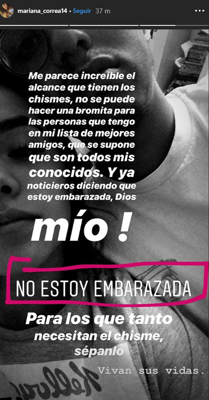 En un tono molesto, Correa señaló: “Me parece increíble el alcance que tienen los chismes, no se puede hacer una bromita para las personas que tengo en mi lista de mejores amigos, que se supone que son todos mis conocidos, y ya noticieros diciendo que estoy embarazada”.