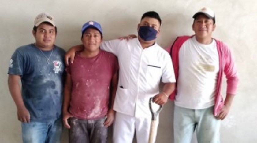 Manuel Chimas, oriundo del municipio de Oxkutzca, México, estuvo trabajando como albañil para pagarse sus estudios, tras obtener el título celebra con sus excompañeros de obra.