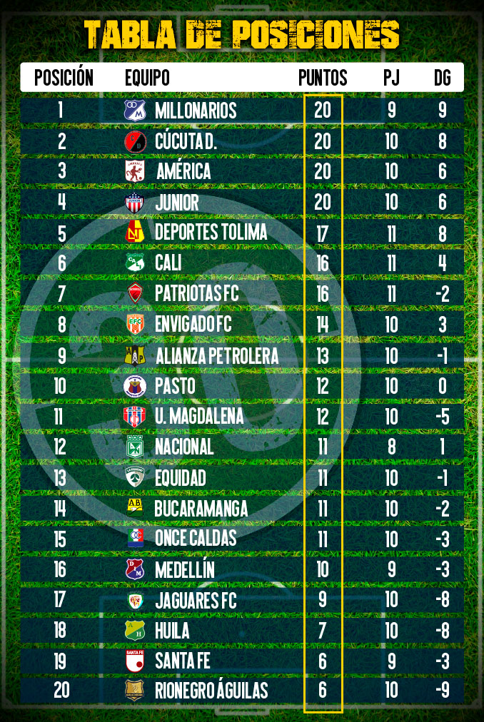 Millonarios, Cúcuta Deportivo, América y Atlético Junior, tienen 20 puntos cada uno, y en su orden ocupan los cuatro primeros lugares del escalafón.