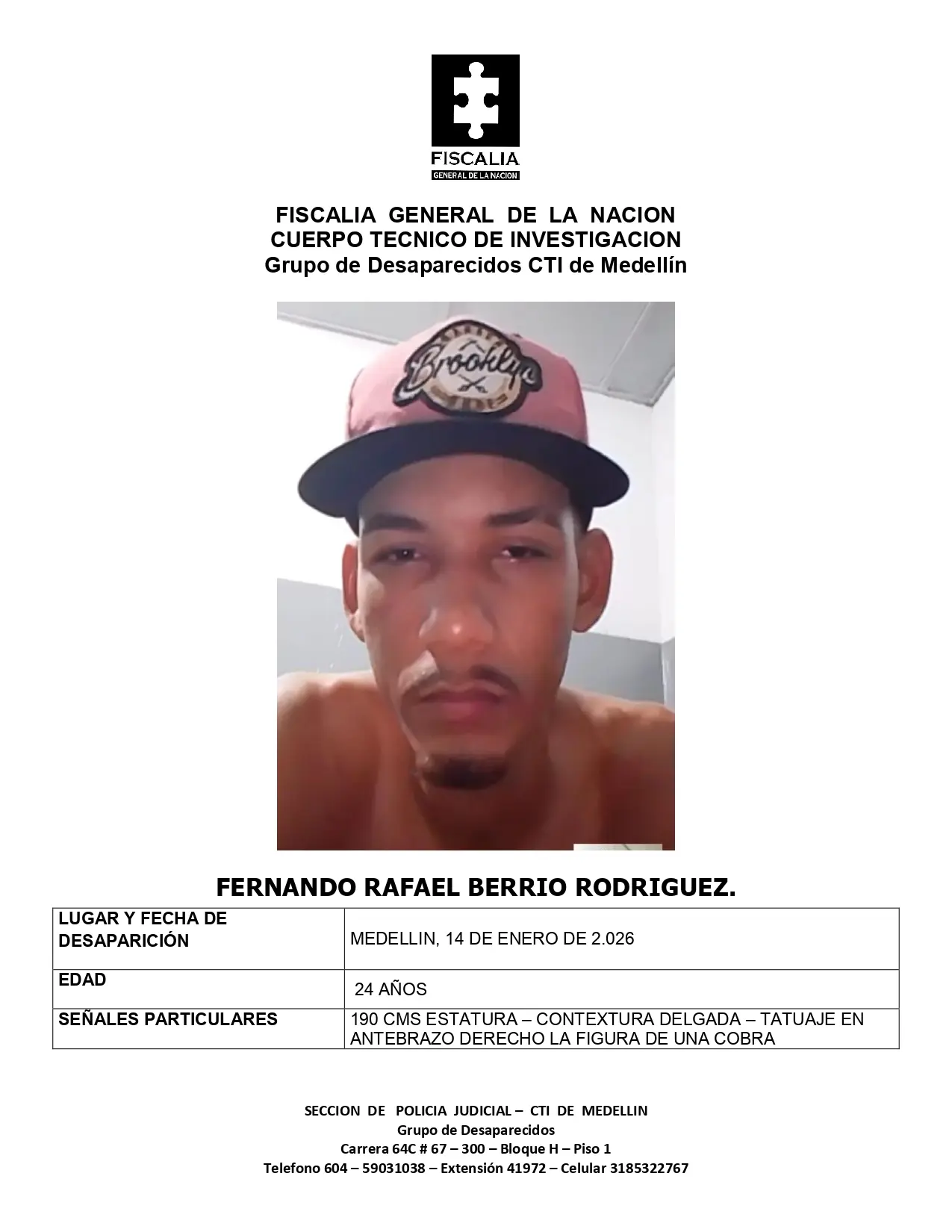 Minuto30.com .- La familia de Fernando Rafael Berrío Rodríguez y las autoridades judiciales de Medellín han emitido una alerta urgente tras su desaparición. El joven, de 24 años de edad, fue visto por última vez en la capital antioqueña el pasado 14 de enero de 2026.