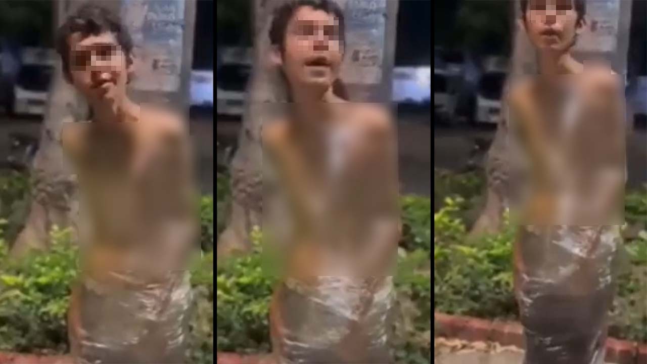 En redes sociales se hizo hace poco muy viral un video donde se ve como algunos habitantes enfurecidos, amarran con papel plástico a un poste a un joven que presuntamente estaba dedicado a robar en el sector.