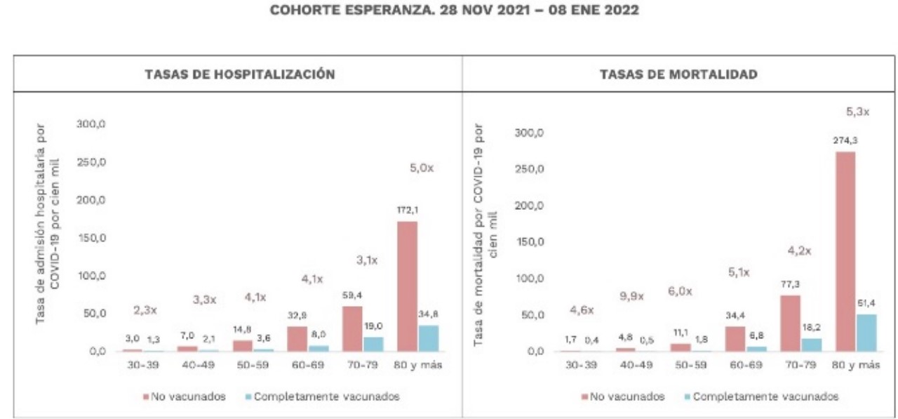 El director explicó que, “en todos los grupos de edad analizados, consistentemente se observa ese mayor riesgo en las personas no vacunadas, que varió entre 3 a 6 veces, durante el mes de diciembre. Esos riesgos pueden variar de acuerdo con el momento de pico (situación epidemiológica) y el tiempo que haya pasado desde que las personas son vacunadas, dado los cambios de la protección de las vacunas en el tiempo, especialmente cuando no han recibido su refuerzo, por esto en periodos más largos el riesgo relativo estimado puede ser diferente”.
