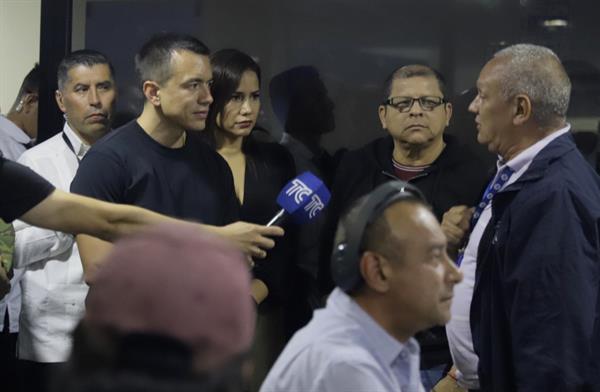Mientras tanto, a menos de un metro de distancia los periodistas le hacían preguntas insistentemente: "¿Qué mensaje trae para los empleados del canal?", "¿cuál es la solicitud que le hace el Gobierno de Ecuador a la comunidad internacional?", "¿cómo Colombia y Perú pueden ayudar a que Ecuador le gane la guerra a las bandas criminales?", "¿el narcotráfico es el responsable de esta ola de violencia?"