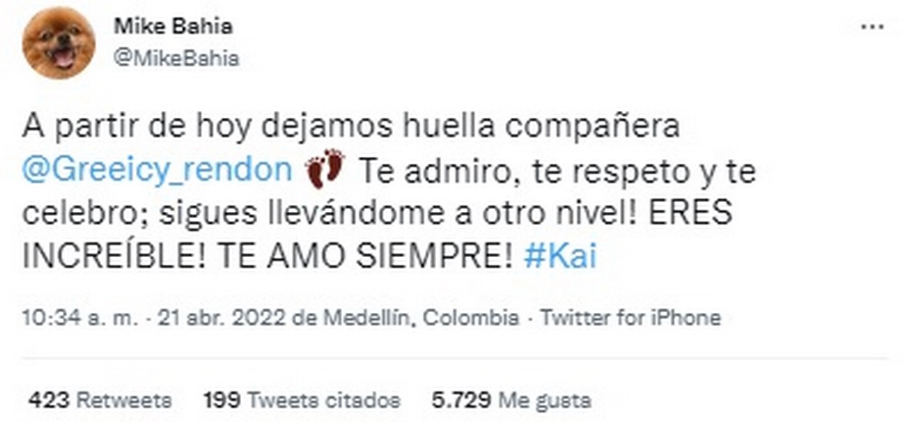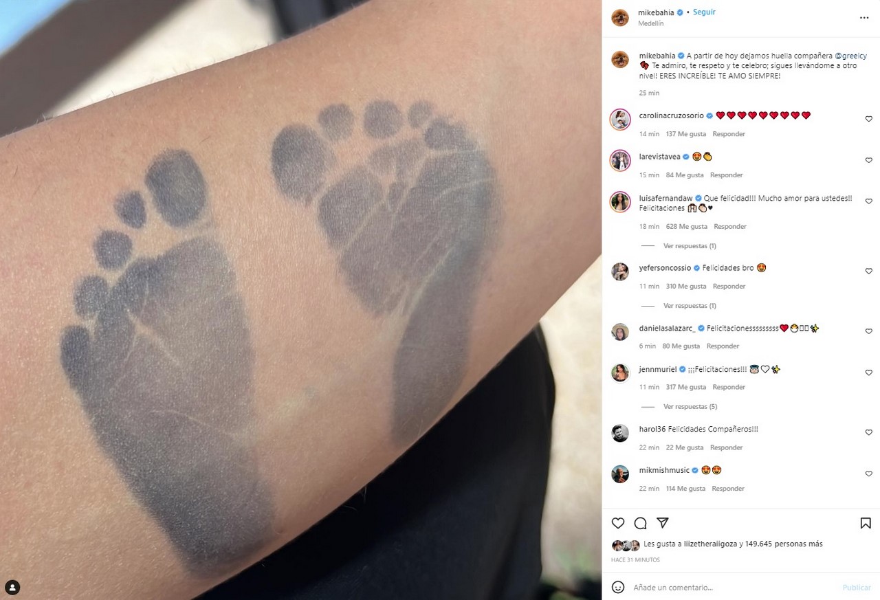 “A partir de hoy dejamos huella compañera Greeicy Rendón. Te admiro, te respeto y te celebro; sigues llevándome a otro nivel!”, escribió en su cuenta de Twitter. Mientras que en su cuenta de Instagram publicó una fotografía de las huellas de su bebé y una imagen en la que sale la artista al parecer después de tener a su primer hijo.