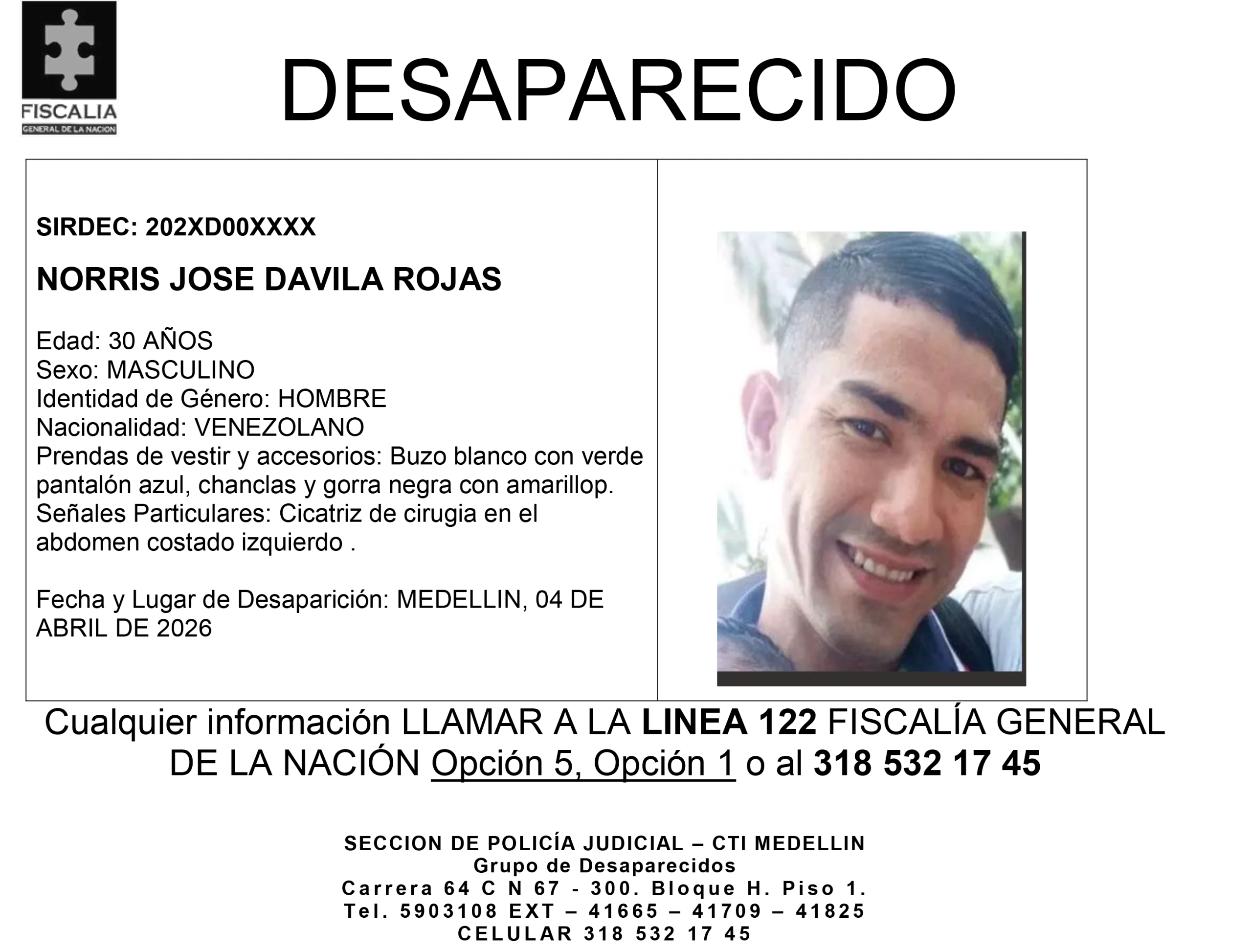 Resumen: Norris José Dávila Rojas es un hombre venezolano de 30 años, cuya desaparición fue reportada en la ciudad de Medellín el 4 de abril de 2026. De acuerdo con la información disponible, su identidad de género es masculina y no se han proporcionado más datos personales adicionales sobre su ocupación o entorno.