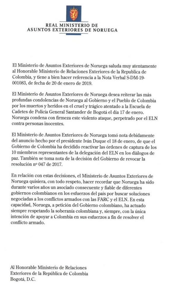 De esta manera Noruega toma posición respecto a las peticiones del presidente Iván Duque de reactivar las órdenes de captura contra los líderes de la guerrilla que se encuentran en la Habana luego del atentado contra la Escuela General Santander.