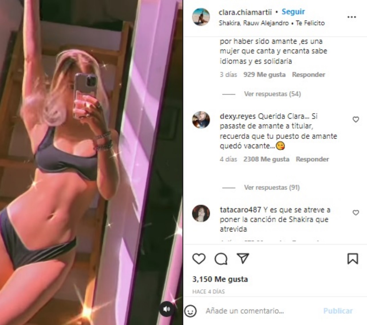 Por medio de su cuenta de Instagram, la mujer publicó un video en el que sale bailando frente a un espejo al ritmo de la canción de la barranquillera, Clara Chía usa un vestido de baño de dos piezas y también juega de manera sensual con su cabello.