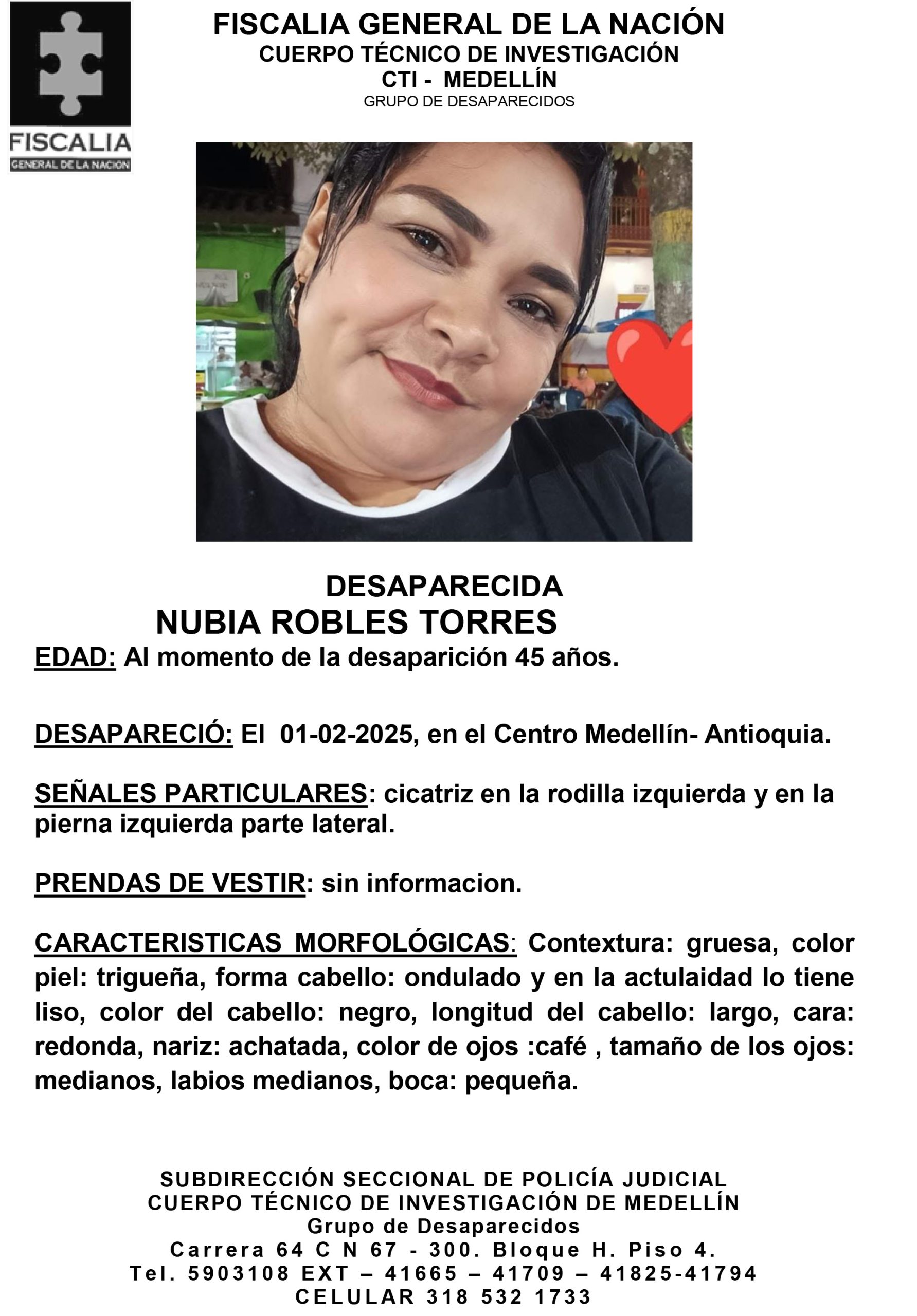 Resumen: Nubia Robles Torres desapareció el 1 de febrero de 2025 en el Centro de Medellín, Antioquia, a la edad de 45 años.