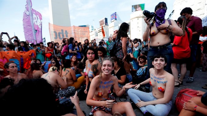 “Enseñar el cuerpo no es algo sucio”, dijo la activista, rodeada de manifestantes con carteles que llamaban a “Liberar los pechos, liberar la mente”. “Las mujeres deben tener el mismo derecho que los hombres para ir en “topless” en público”, añadió.