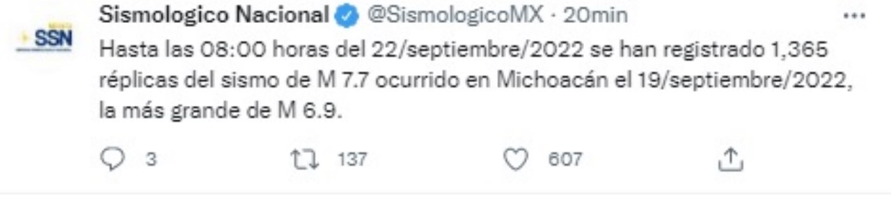 «Tuvimos una réplica del sismo con magnitud de 6,9 con epicentro en Coalcomán. Se sintió en Michoacán, Colima, Jalisco, Guerrero y Ciudad de México. Hasta ahora no hay reporte de daños», escribió el presidente mexicano, Andrés Manuel López Obrador, en sus redes sociales.
