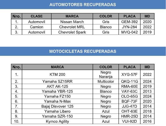 Por último, las autoridades lograron la recuperación de los siguientes automotores: