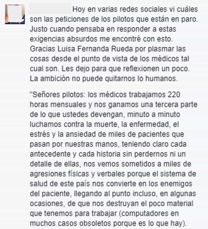 En redes sociales se ha hecho viral un mensaje, redactado por una supuesta médica colombiana, para los pilotos de Avianca que se encuentran en paro. En el comentario en el que según ella “invita a la reflexión” la mujer argumenta que le parecen “absurdas” las peticiones de los pilotos, “Con el respeto que me merecen […]