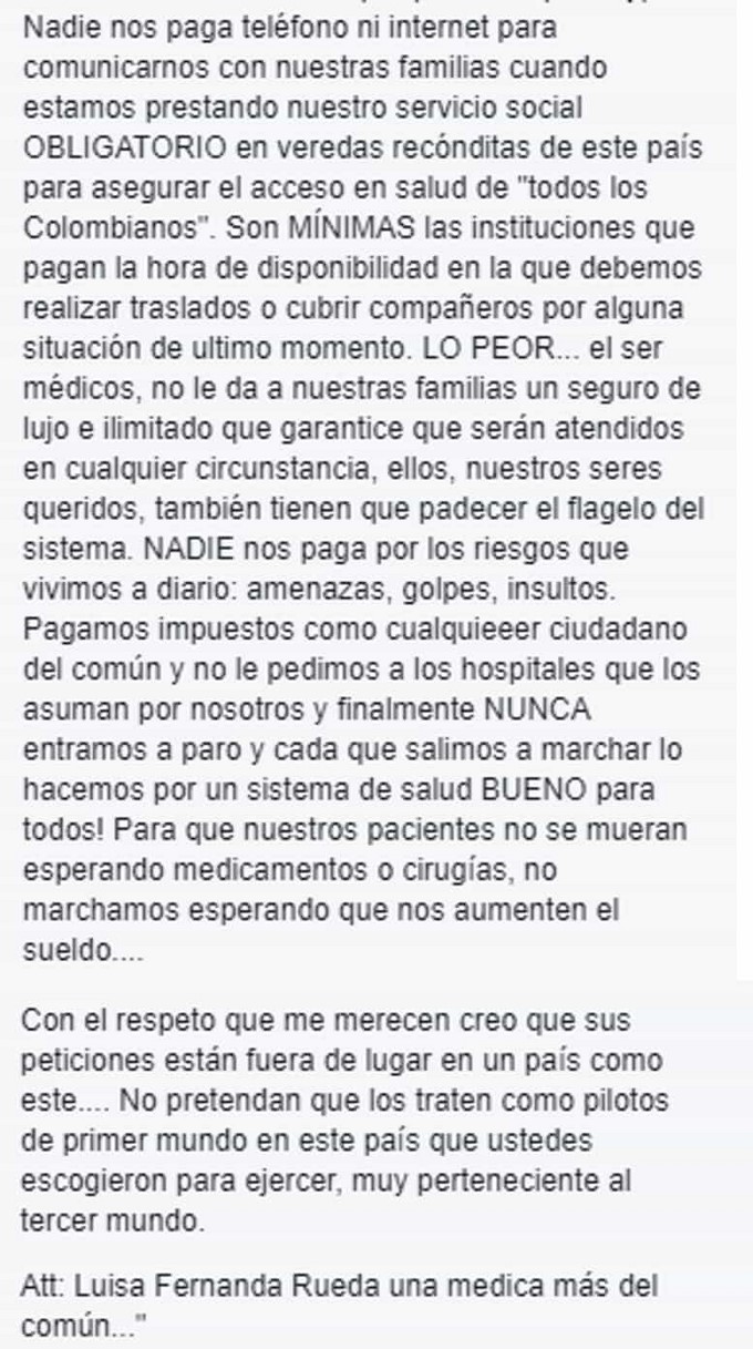 El post firmado por la médica Luisa Fernanda Rueda, ha sido compartido por varios usuarios de Facebook, quieres al parecer, se muestran a favor de la doctora.