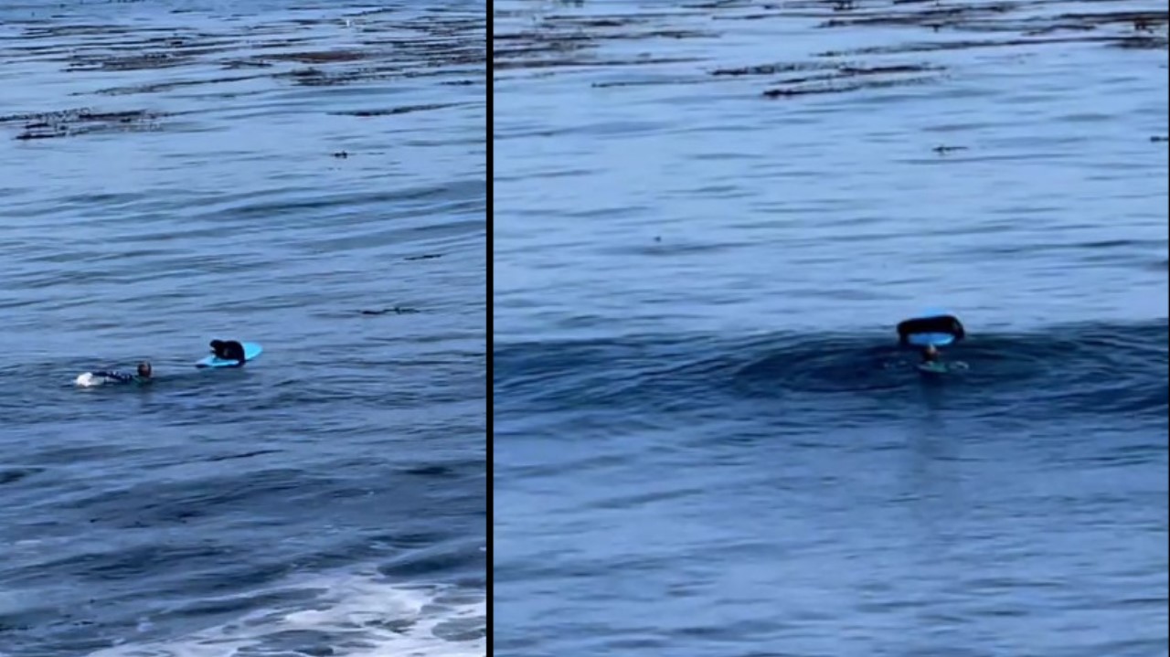En redes sociales han publicado el video que deja ver a una nutria marina que le roba la tabla a un surfista y no quería entregársela.