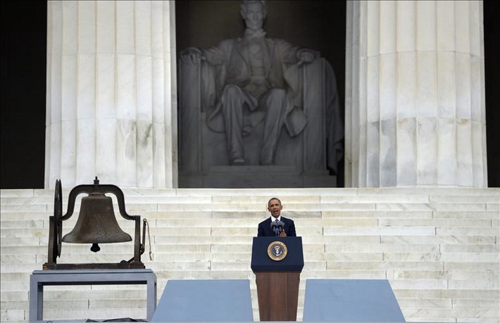 El mandatario estadounidense, Barack Obama, pronuncia un discurso durante una ceremonia para conmemorar el 50 aniversario de la Marcha en Washington en el Monumento a Lincoln, en Washington DC (EE.UU.). EFE