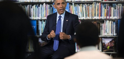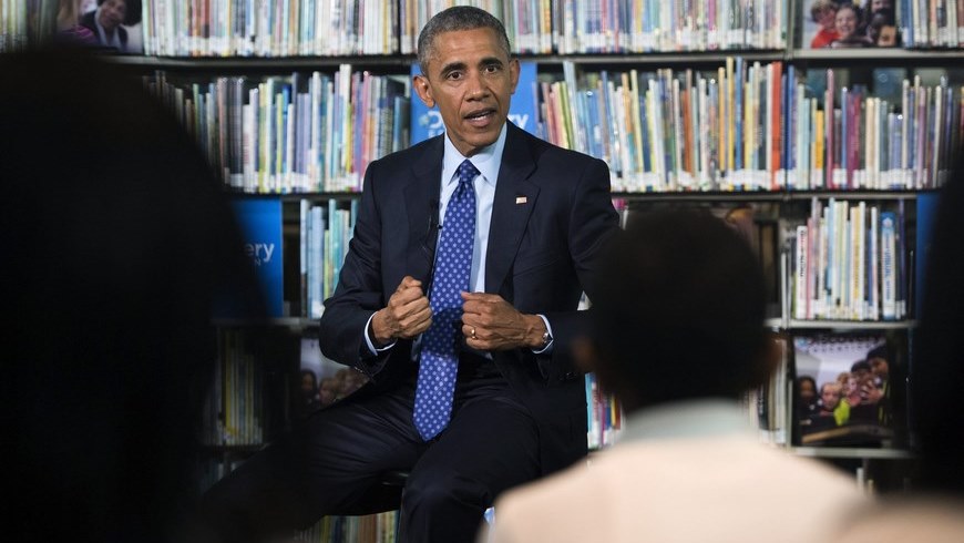 El presidente estadounidense Barack Obama, participa en una “excursión virtual” con estudiantes de educación intermedia (“middle school”), en la biblioteca Anacostia de Washington, Estados Unidos, hoy, jueves 30 de abril de 2015. EFE