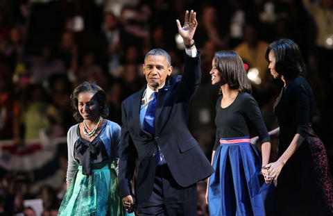 Obama, acompañado por su esposa, Michelle, y sus hijas, Sasha y Malia, en la tarima del centro de convenciones, tendió la mano a su rival, el republicano Mitt Romney, a quien venció en una reñida competencia que no se definió hasta el último momento.