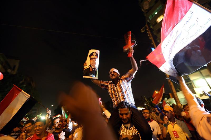 Egipcios opositores del presidente Mohamed Mursi celebran este miércoles 3 de julio de 2013, a las afueras del palacio presidencial en El Cairo (Egipto), tras el anuncio del Ejército egipcio, que suspendió la Constitución y declaró al presidente del Tribunal Constitucional como nuevo mandatario provisional del país en lugar del islamista Mohamed Mursi