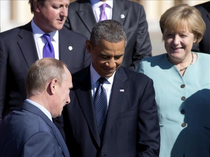 El presidente ruso, Vladímir Putin (delante izq), el primer ministro británico, David Cameron (atrás izq), el presidente de Estados Unidos, Barack Obama (c), y la canciller alemana, Angela Merkel, en el segundo día de la cumbre del G20 que acoge la ciudad de San Petersburgo (Rusia). EFE