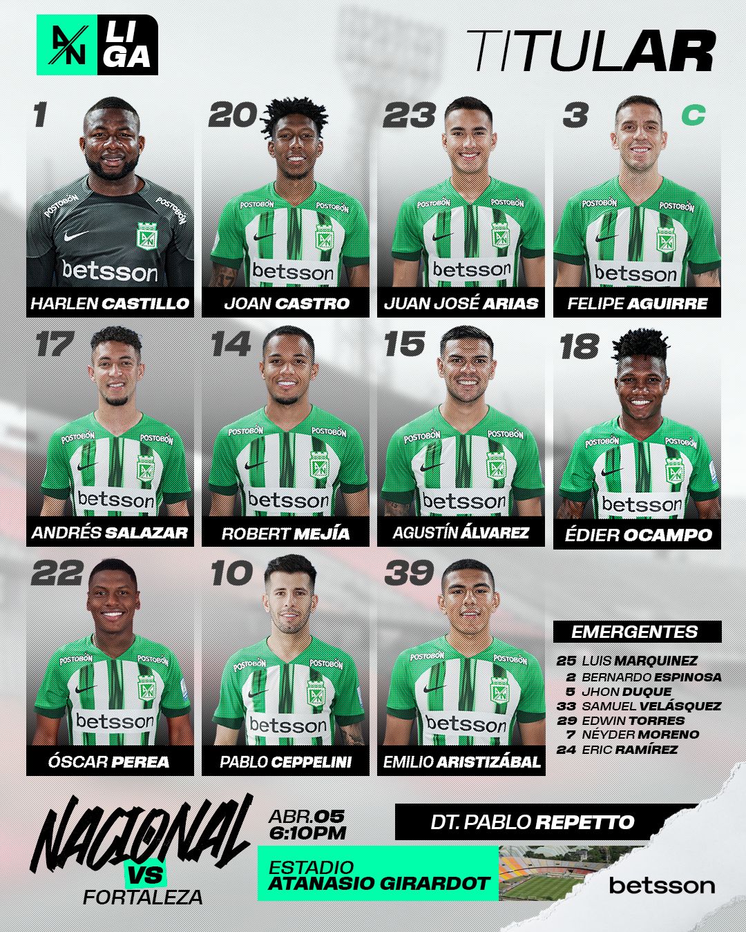 Titulares de Atlético Nacional para enfrentar a Fortaleza.
