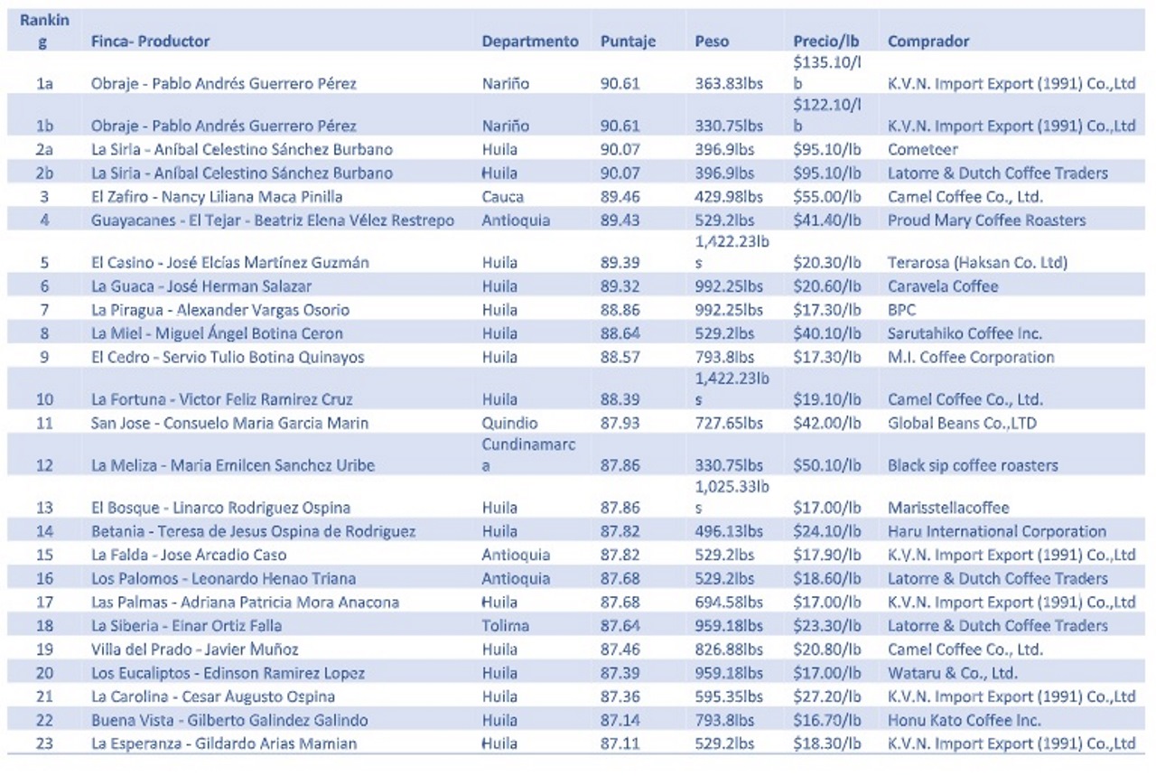 En esta, la 18a edición del concurso, los 157 cafés inscritos fueron evaluados mediante el riguroso método diseñado por Alliance for Coffee Excellence (ACE) en un proceso de más de cinco meses en el que a lo largo de tres etapas de catación siete catadores nacionales y 22 catadores internacionales de tres continentes, escogieron los mejores cafés de la cosecha del último año. El café de Nariño, se impuso como el mejor de todos. El podio lo completaron cafés presentados por Aníbal Sánchez del Huila (2o lugar) y tercer para Nancy Maca del Cauca. (Ver clasificación adjunta).