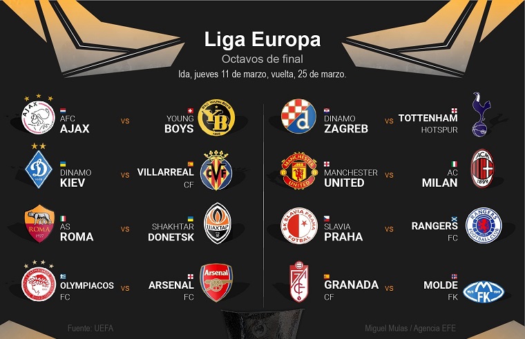 Emparejamientos de los octavos de final de la Liga Europa tras el sorteo celebrado este viernes en la sede de la UEFA en Nyon (Suiza):