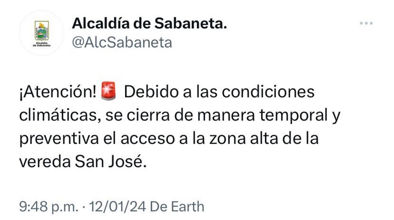 Es así que la Alcaldía de Sabaneta ha tomado la decisión de cerrar de manera temporal el acceso a la vereda Sabaneta, el cual se da por la calle 77 sur.