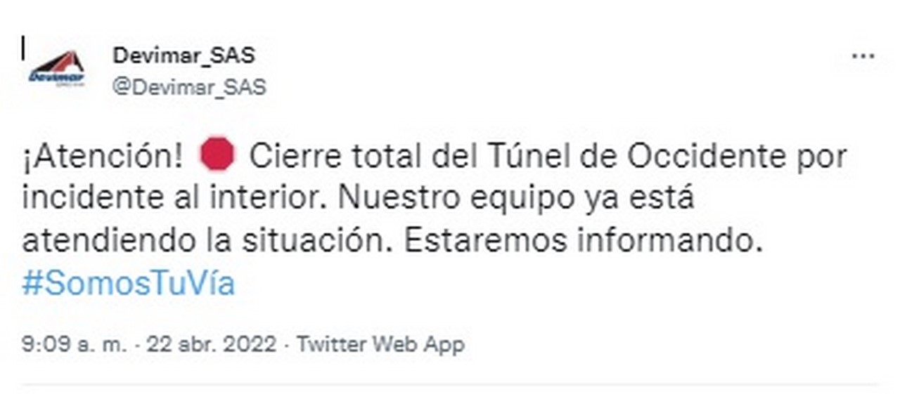 La Concesionaria Desarrollo Vial al Mar, encargada del Túnel de Occidente, informó a las 9:09 de la mañana: “¡Atención! Cierre total del Túnel de Occidente por incidente al interior. Nuestro equipo ya está atendiendo la situación”.