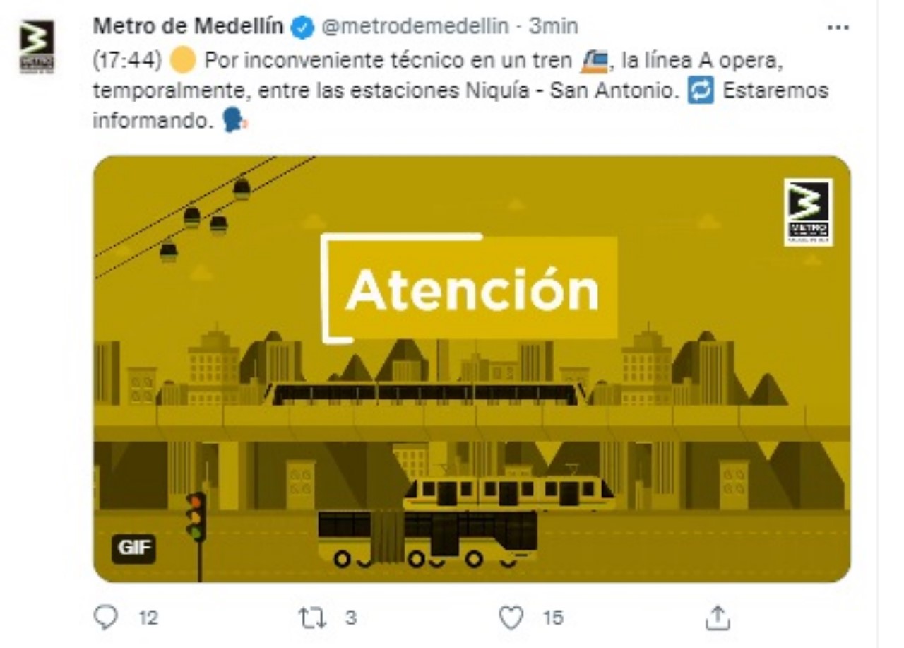 “Por inconveniente técnico en un tren, la línea A opera, temporalmente, entre las estaciones Niquía – San Antonio”, informaron en la cuenta de Twitter.