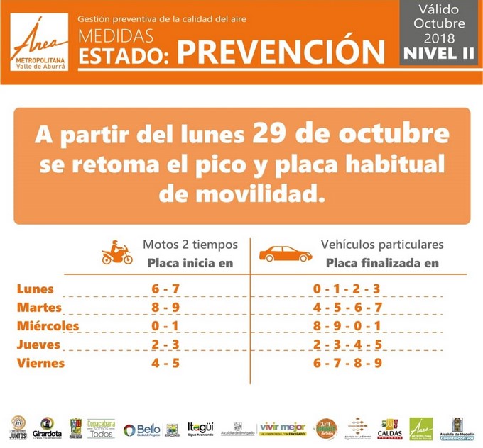 Desde este lunes 29 de octubre retorna el pico y placa habitual a los 10 municipios que componen el área metropolitana del Valle del Aburrá.