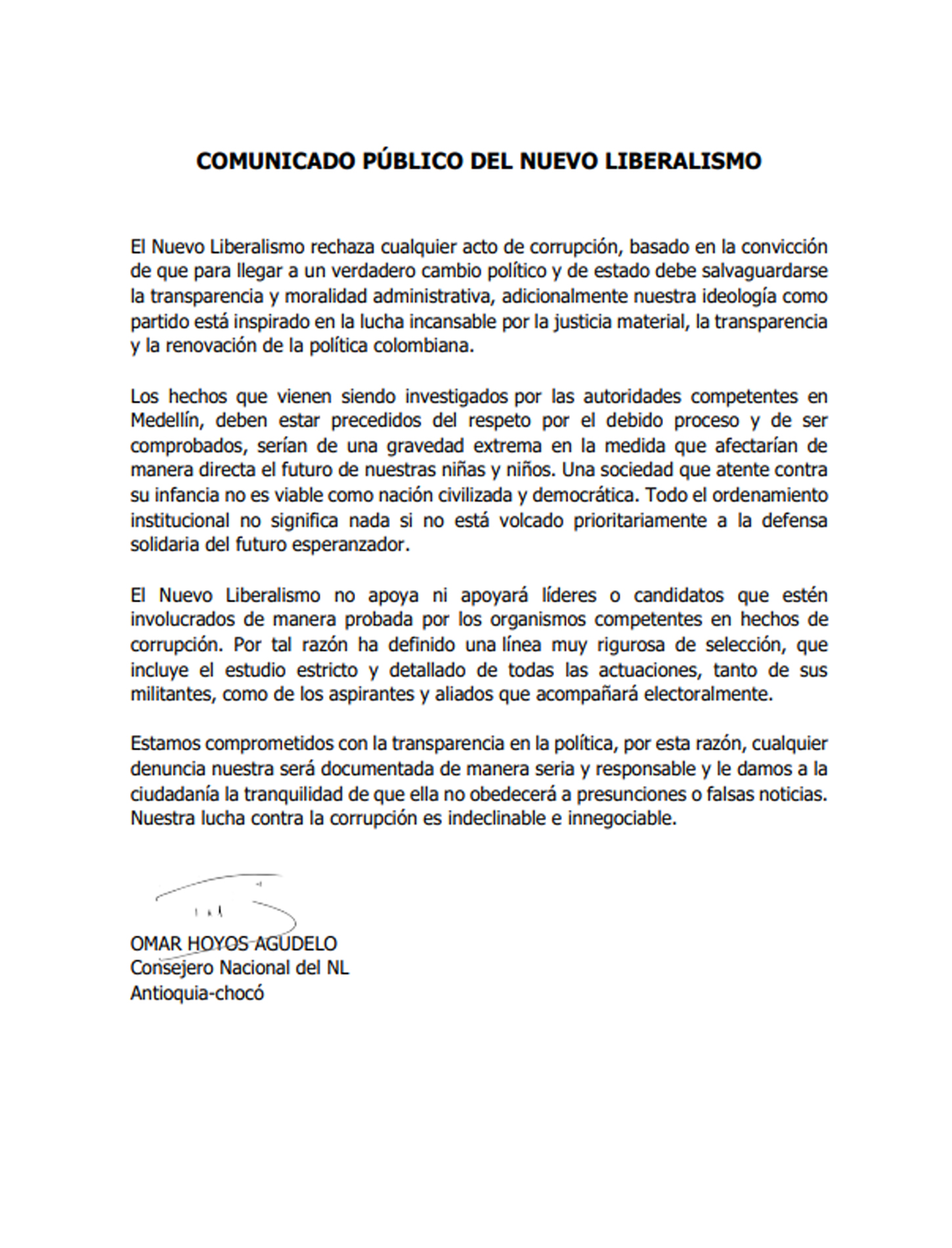 A través de un comunicado el consejero nacional del Nuevo Liberalismo, Omar Hoyos Agudelo, rechazó cualquier acto de corrupción que sea probado en Medellín.