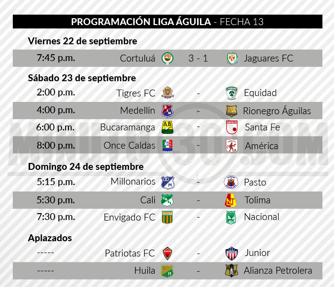 Con el triunfo de Jaguares de Córdoba (1-3) en su visita a Cortuluá en el Estadio Pascual Guerrero, se abrió el viernes la programación de la fecha 13 de la Liga Águila II-2017.