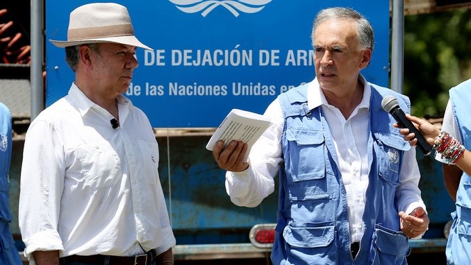 El jefe de la misión observadora de la ONU en Colombia, Jean Arnault (d), junto al presidente Juan Manuel Santos. EFE