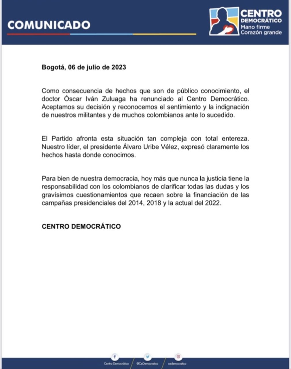 La renuncia presentada por el excandidato fue aceptada por el Centro Democrático y se puntualiza en la misiva que hoy más que nunca la justicia tiene la obligación de clarificar todas las dudas y gravísimos cuestionamientos que recaen sobre la financiación de las campañas presidenciales de 2014, 2018 y 2022.