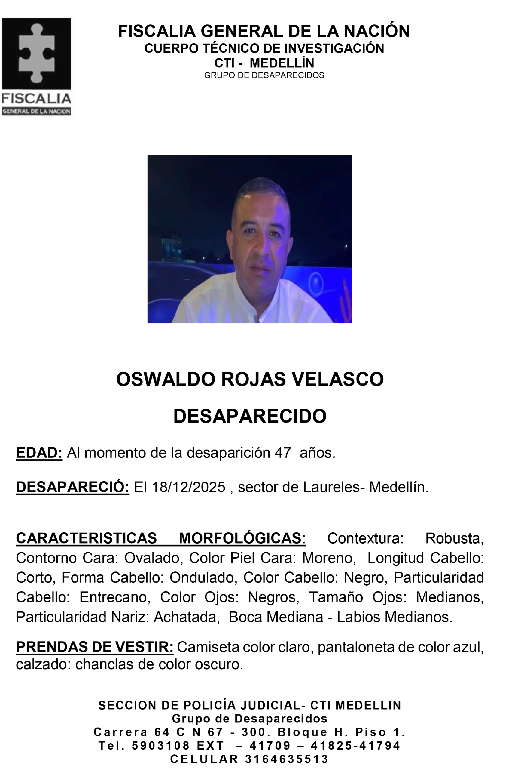 Resumen: Oswaldo Rojas Velasco, de 47 años, desapareció el 18 de diciembre de 2025 en el sector de Laureles, Medellín.