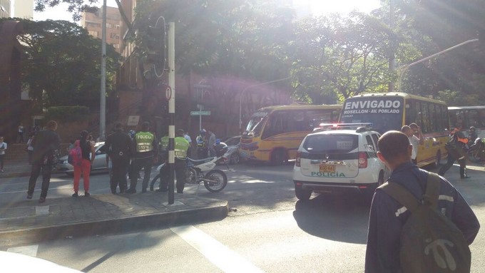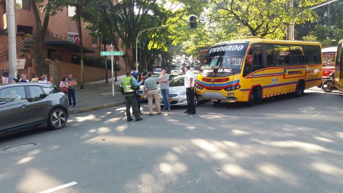 Justo a pocos metros de donde se presentó un aparatoso accidente en el que se vio involucrada una buseta escolar con un autobús de servicio público en la calle 5 con avenida El Poblado, se registró otro choque por estar mirando la situación previamente relatada.