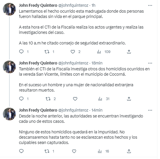 El alcalde de la localidad, John Fredy Quintero, confirmó el asesinato de dos hombres en el parque principal y otras dos en la vereda San Vicente, en límites con el municipio de Cocorná, allí fueron asesinados un hombre y una mujer de nacionalidad extranjera.