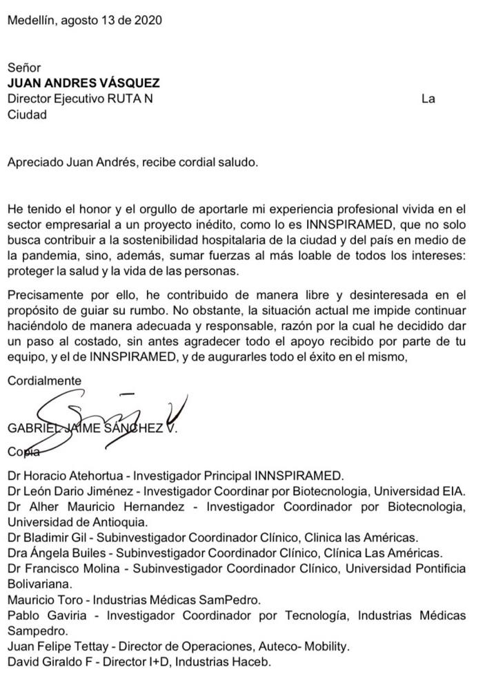 En una carta dirigida al director ejecutivo de Ruta N, Juan Andrés Vásquez, el director de InnspiraMed, la filial que desarrolló los ventiladores durante la pandemia, Gabriel Sánchez, presentó su renuncia a su cargo.